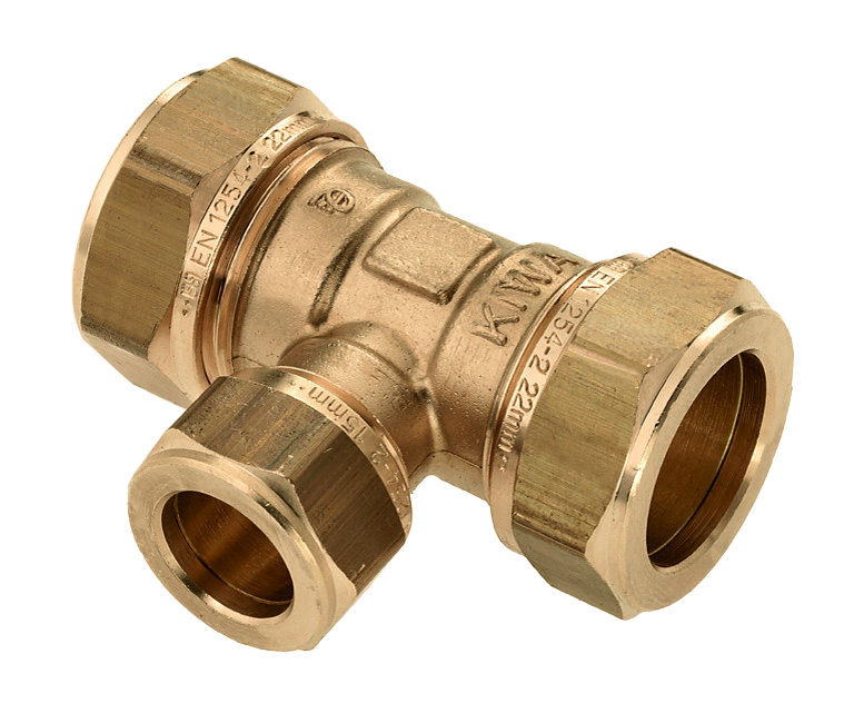 Messing & messing vertinde knelfittingen. T-koppeling, verlopend.