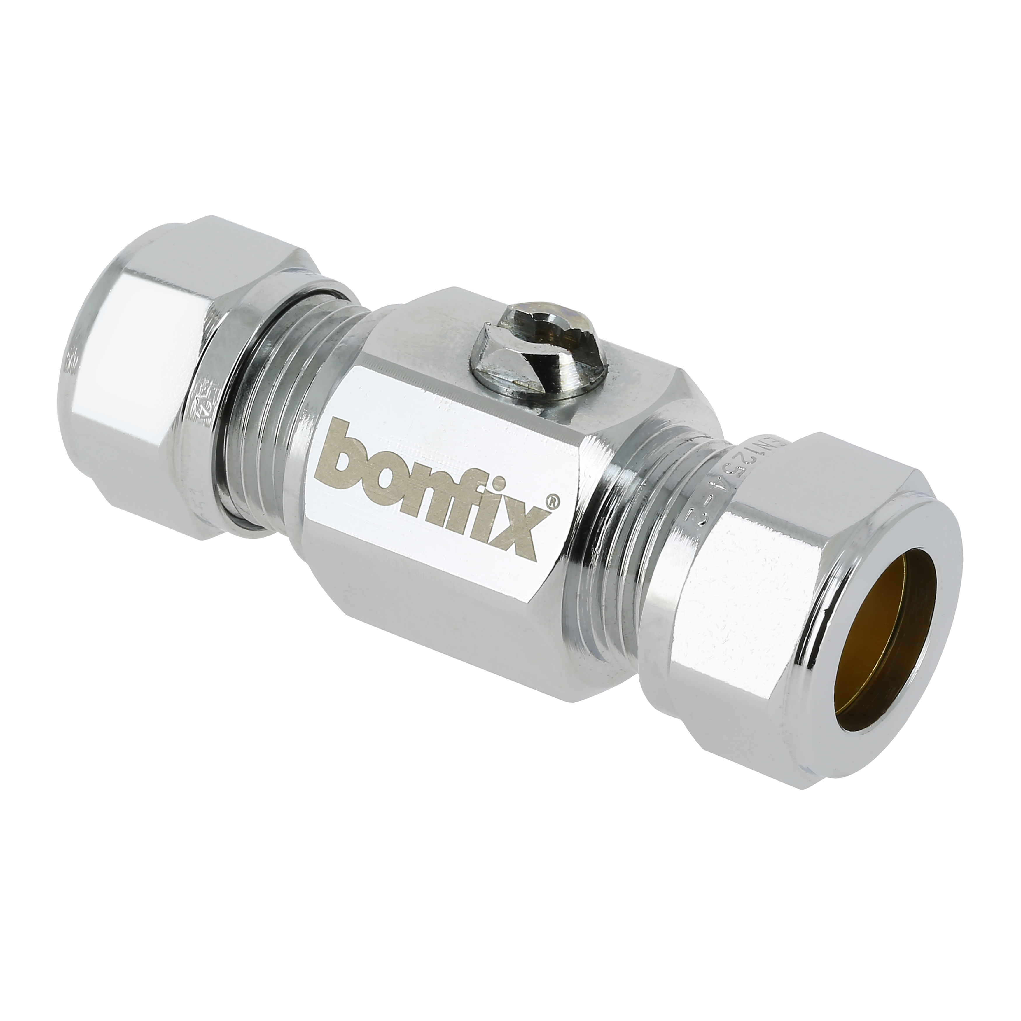 Kogel (hoek) stopkranen, verchroomd. Schroevendraaier bediening. 2 x knel.