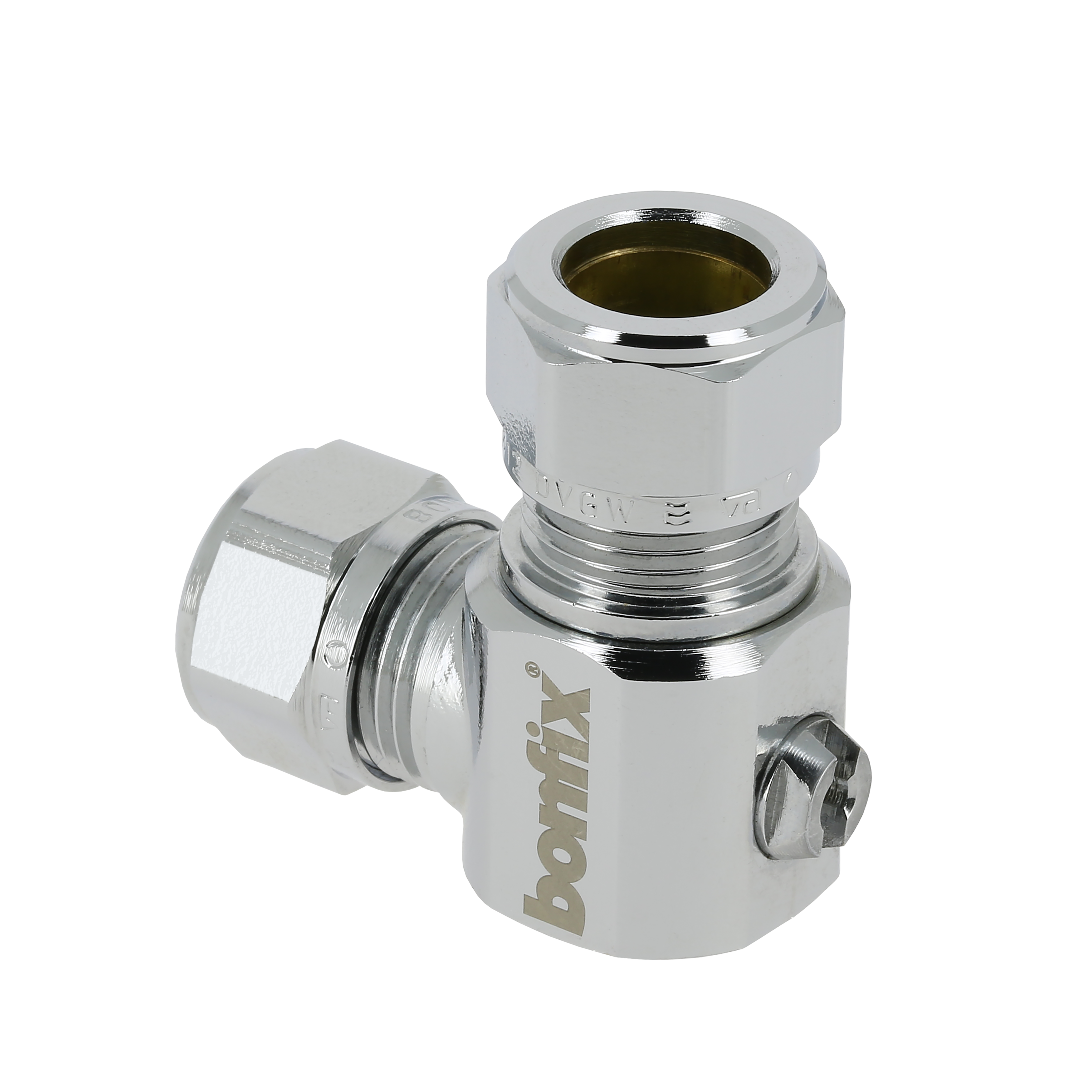 Kogel (hoek) stopkranen, verchroomd. Schroevendraaier bediening || haaks. 2 x knel.