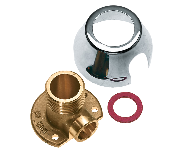 Sanitaire aansluitkoppelingen. Muurplaatkoppeling met verchroomde rozet en fiberring.