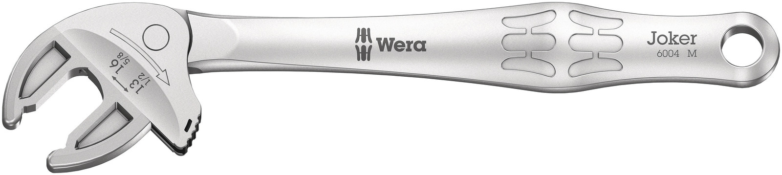 Veel gebruikers zouden graag willen beschikken over een universeel gereedschap dat voor zoveel mogelijk zaken te gebruiken is. Eén stuk gereedschap voor meerdere metrische en inch maten. En dit zou zich dan ook nog eens automatisch aan de verschillende schroefmaten moeten aanpassen. Veilig vastgrijpen, niets beschadigen en een hoge werksnelheid mogelijk maken. Dankzij de traploos en parallel lopende bekken is het gereedschap geschikt voor meerdere maten steeksleutels. De vereiste maat wordt automatisch bij het aanzetten op de zeskantmoer en schroef ingesteld. Het geïntegreerde hefboommechanisme klemt de zeskantschroef of -moer veilig tussen de bekken in, wat het risico op wegglijden en beschadigingen aanzienlijk verkleint. De ratelfunctie maak snel en soepel schroeven zonder telkens het gereedschap te moeten verplaatsen mogelijk. Door toepassing van hoekprisma's kan een terughaalhoek van slechts 30° bereikt worden. De 1-zijde-constructie in combinatie met de ratelfunctie en het hoekprisma maakt werken in krappe ruimtes mogelijk. De instelbare Joker 6004 is een echt universeel schroefgereedschap. Zelfinstellend. Vastgrijpend. Ratelend.
