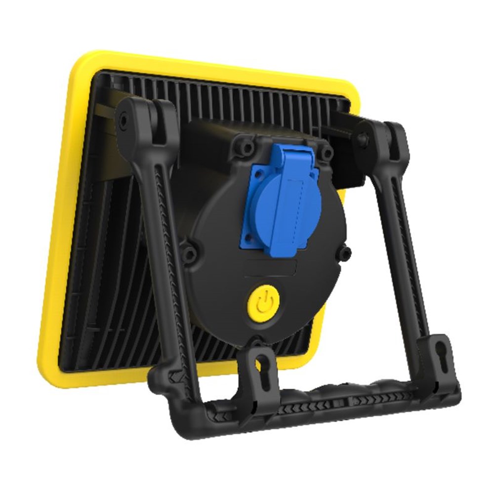 Energiezuinige LED werk/object/bouwlamp (klasse I). Aluminium behuizing met rubberen stootrand (IK09). Voorzien van 32W COB-LED met lichtopbrengst van 3300 Lm. Spatwaterdicht (IP54) en 1 x VDE stekkerdoos aan achterzijde. Inclusief 5m kabel met EU-stekker.