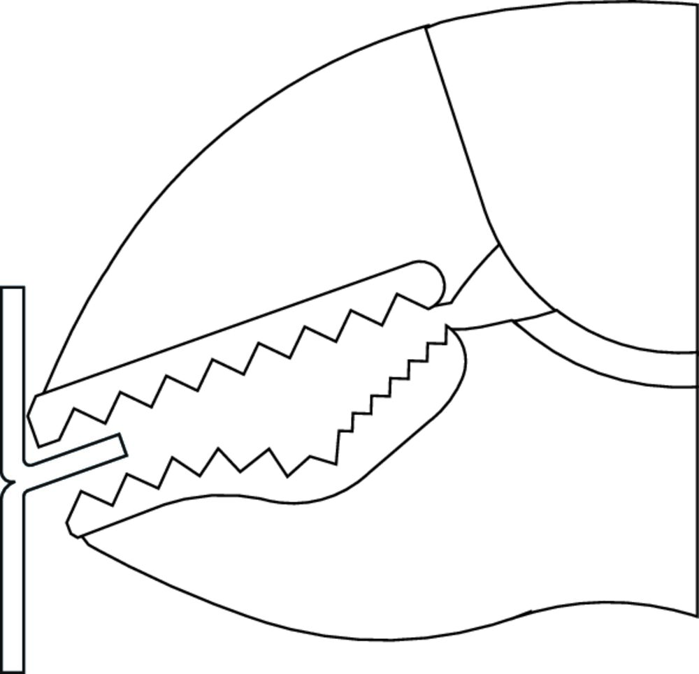- gesmede, geharde bekken, speciaal gevormd, voor zeker klemmen, spannen of vasthouden