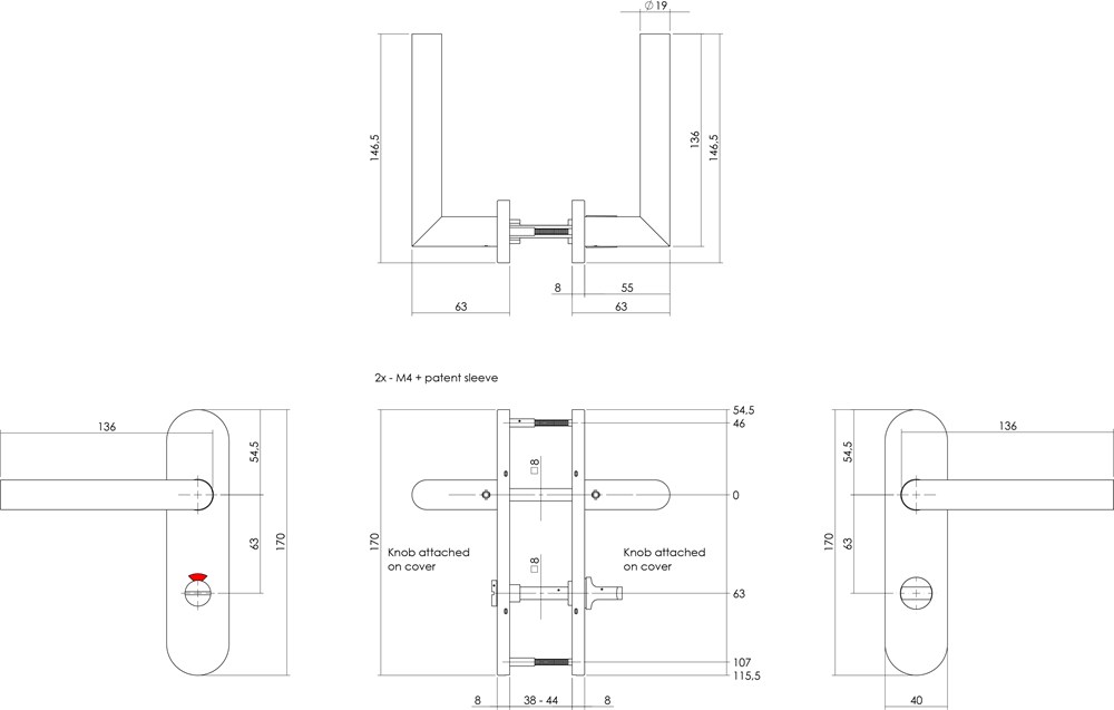 Set deurkrukken en schilden met toiletsluiting; bevestigingsmateriaal