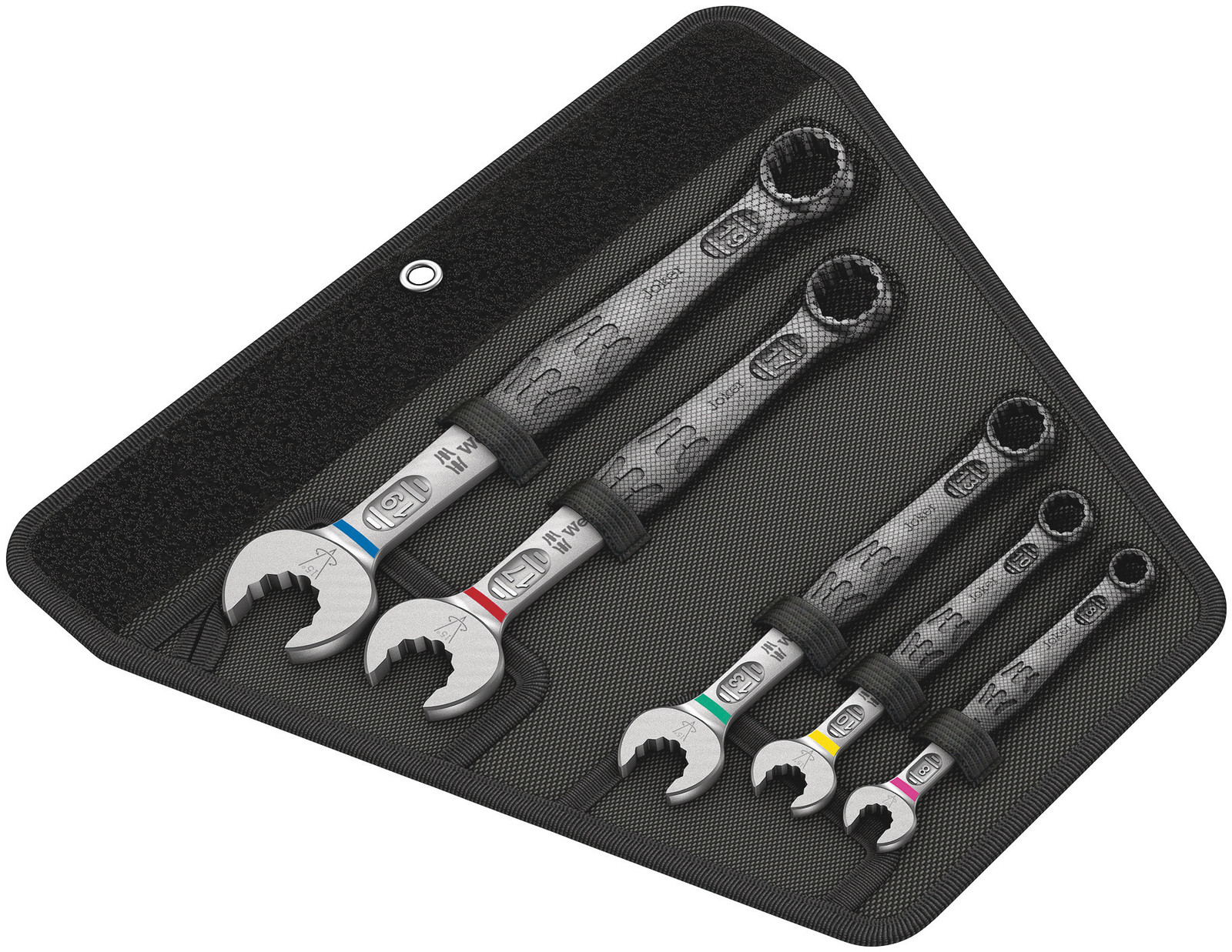 Aangezien ruimtes waarin geschroefd moet worden, steeds krapper worden, is gereedschap vereist waarmee de gebruikers ook in dergelijke situaties goed uit de voeten kunnen. Krappe ruimtes vereisen extra aanzetpunten voor het gereedschap. Laten steeksleutels zich dan ook zodanig aanpassen dat er meer aanzetmogelijkheden komen? Door de bek 7,5° te buigen en een dubbelzeskantgeometrie toe te passen, kon het aantal aanzetpunten worden verdubbeld. Bij meermaals verdraaien van de sleutel over 180° over de lengte-as tijdens het schroeven beschikt de gebruiker over vier aanzetmogelijkheden en kunnen moeren resp. schroefkoppen elke 15° worden 'vastgegrepen'. De Joker 6003 met zijn slimme bekgeometrie vergroot het aantal toepassingsmogelijkheden in krappe ruimtes aanzienlijk. De Joker 6003 vindt als het ware het meest geschikte aanzetpunt na elke omwenteling vanzelf. De slanke en toch robuuste ringzijde maakt een hoek van 15° tot de gereedschapsas. De hoogwaardige coating zorgt voor een langdurige en hoge corrosiebescherming. Met 'Take-it-Easy' Toolfinder: Kleurcodering op maat. De Joker etuis kunnen dankzij klittenband aan de achterzijde worden bevestigd aan wanden, rekken, gereedschapswagens en het Wera 2go systeem.