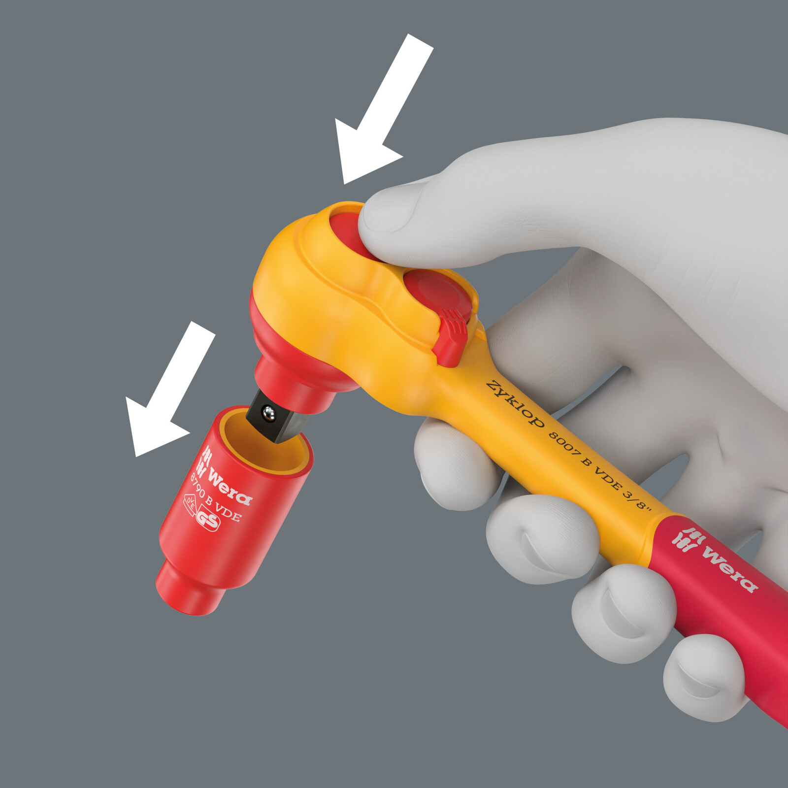 Geïsoleerde en 100% individueel geteste Zyklop ratel, doppen en verlengstukken voor veilig werken bij spanningsvoerende componenten tot 1.000 V.