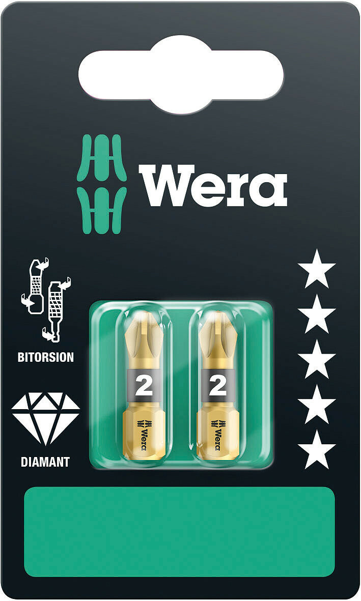Bits voor Pozidriv*-schroeven met minuscule diamantdeeltjes op bitpunt. Deze zorgen voor een veilige grip op de schroef, verkleinen de vereiste aandrukkracht en reduceren het risico op wegglijden. Met torsiezone, waarin bij belastingspieken kinetische energie wordt afgeleid. Hierdoor wordt de levensduur van het product aanzienlijk hoger. 1/4" zeskant, passend in houders conform DIN ISO 1173-F 6,3. * Pozidriv = geregistreerd handelsmerk van de firma European Industrial Service Ltd.