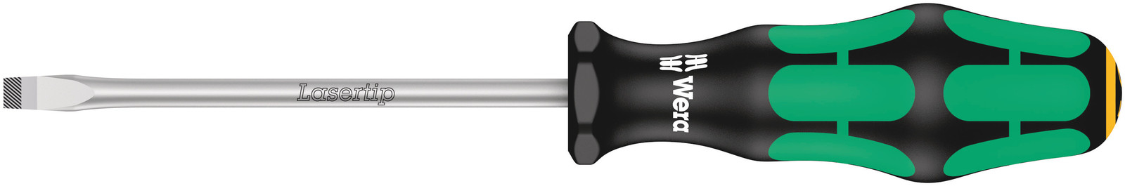 Hoogwaardige Kraftform Plus schroevendraaiers. Meercomponenten Kraftform Plus greep om prettig en ergonomisch verantwoord te kunnen werken en blaren en schuurplekken te voorkomen. Harde gripzones voor een hoge werksnelheid, zachte gripzones voor een hoge draaimomentoverbrenging. De punt van Wera Lasertip schroevendraaiers wordt met laserstralen microscopisch fijn opgeruwd. Dit ruwe oppervlak "bijt" zich letterlijk vast in de schroefkop. Onbedoeld wegglijden behoort zo tot het verleden. "Take it easy toolfinder" met kleurcodering op profiel en maatcode - voor het eenvoudig en snel vinden van het benodigde gereedschap. Zeskantige wegrolbescherming verhindert telkens wegrollen op de werkplek.
