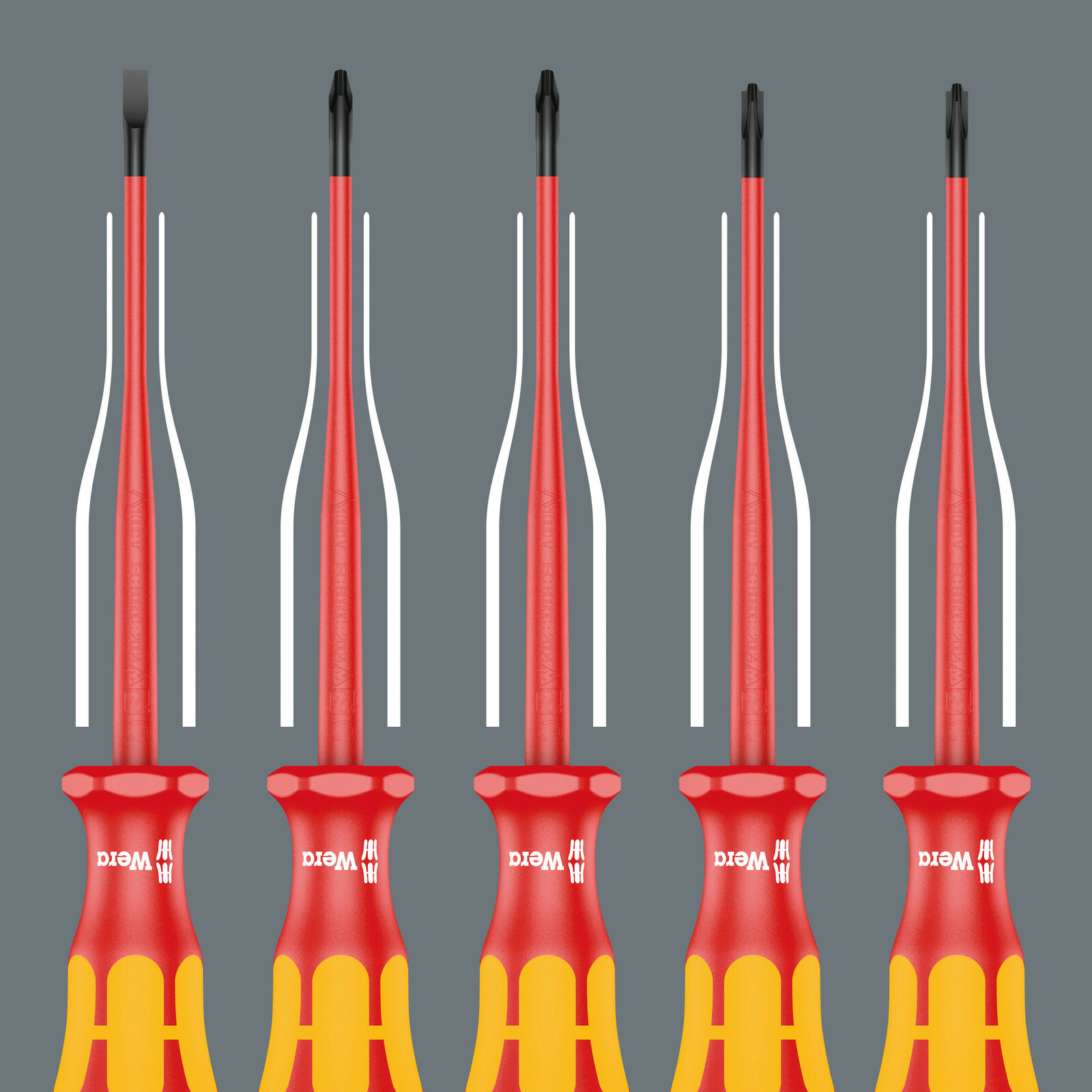 Gereduceerde klingdiameter en geïntegreerde veiligheidsisolatie, om diepliggende schroeven en veerelementen te kunnen bereiken en verdraaien. Combi-profiel sleuf/Phillips, in het bijzonder geschikt voor klemmenblokken, zekeringkasten, schakelaars en relais. Kraftform Plus-handgreep om prettig en ergonomisch verantwoord te kunnen werken en blaren en schuurplekken te voorkomen. Harde gripzones voor een hoge werksnelheid, zachte gripzones voor een hoge draaimomentoverdracht. Wegrolbescherming verhindert telkens wegrollen op de werkplek.